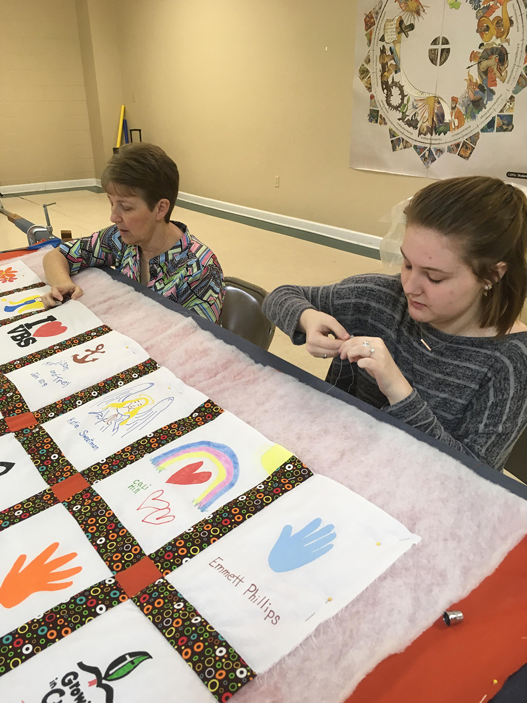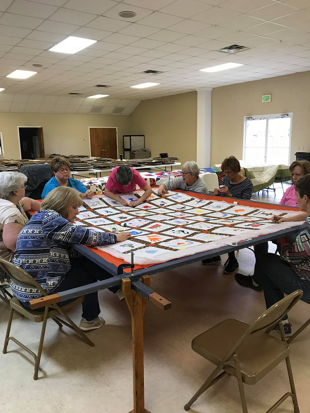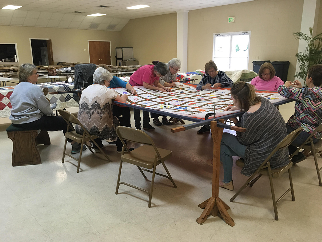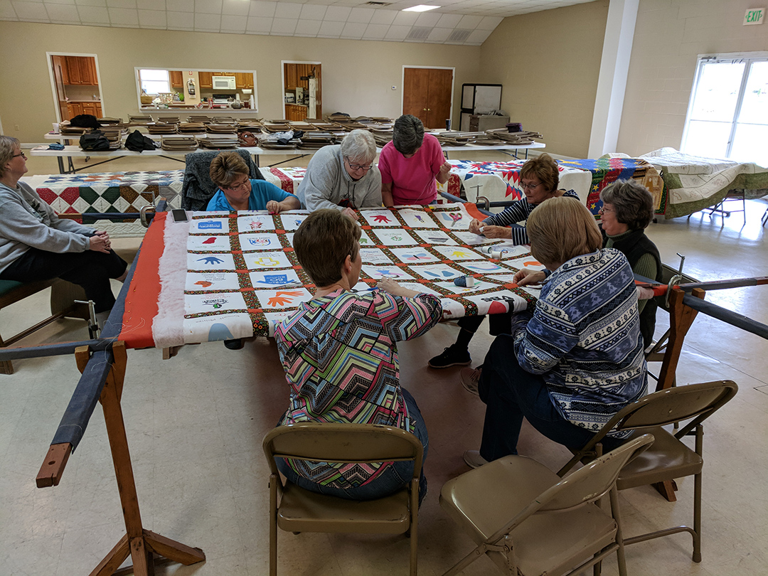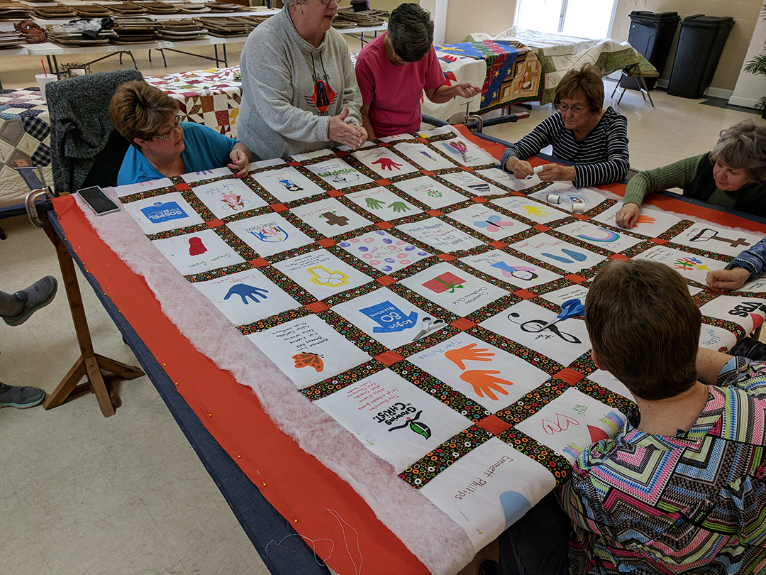 Thirteen ladies met together and quilted the 125th Anniversary quilt on Saturday. The quilt celebrates the children and youth of our church. The ladies had a great day together and reminisced about the time that they quilted the quilt currently hanging in the church.