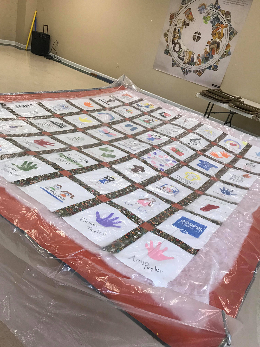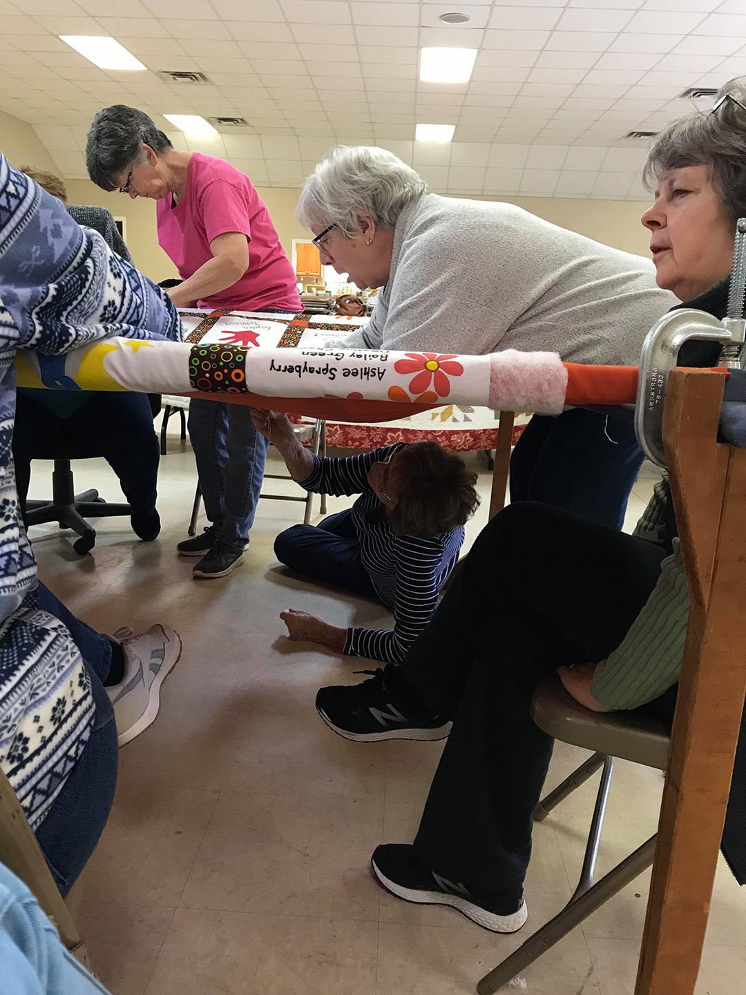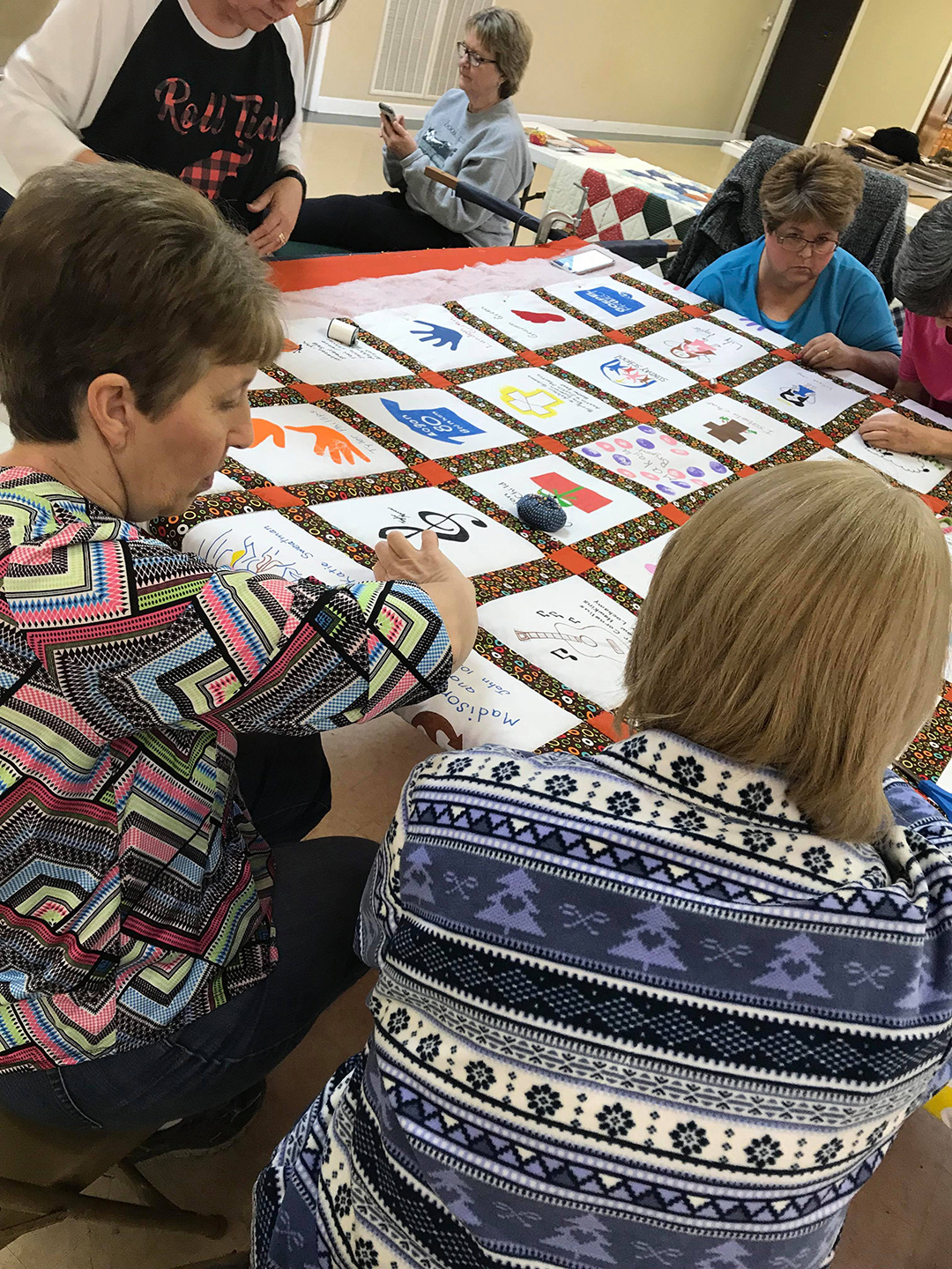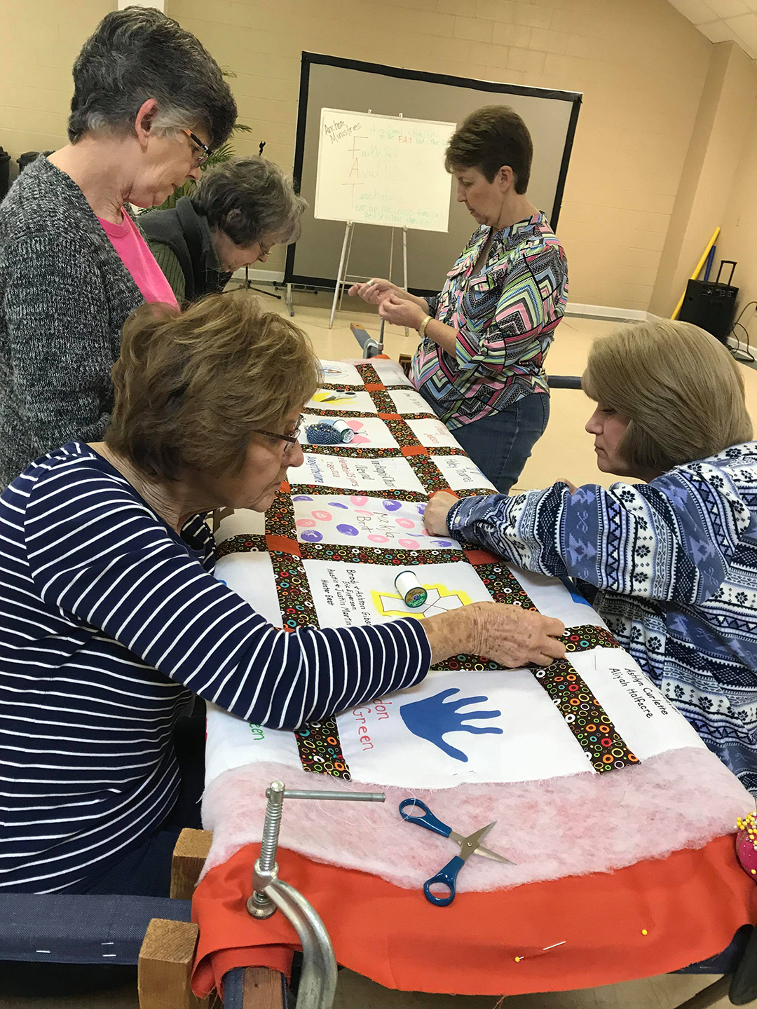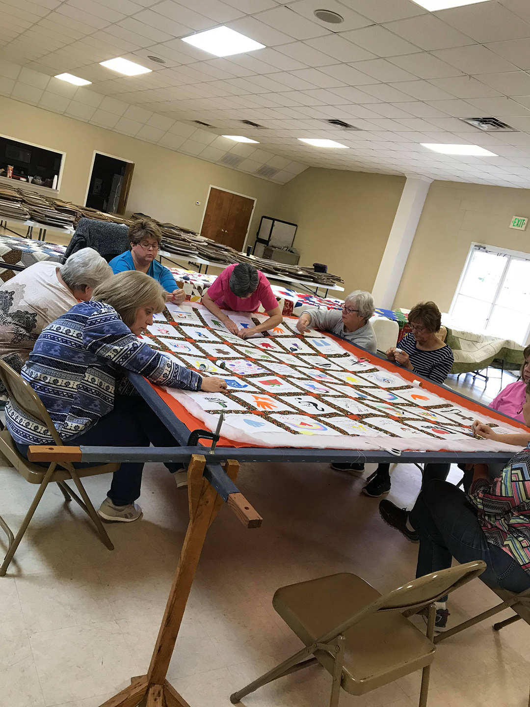 Thirteen ladies met together and quilted the 125th Anniversary quilt on Saturday. The quilt celebrates the children and youth of our church. The ladies had a great day together and reminisced about the time that they quilted the quilt currently hanging in the church.
